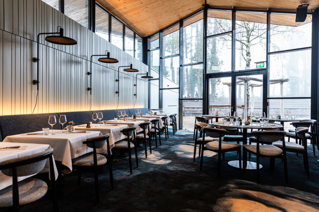 Une brasserie contemporaine chic à l’orée de la forêt, parfaite pour des assiettes généreuses (croquettes de crevettes, poulet fermier) sur une magnifique terrasse.